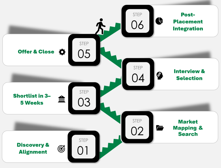 From discovery call to shortlist to successful hire, our structured process delivers elite talent in 4–6 weeks. We manage everything from market mapping to interviews, negotiations, and onboarding.